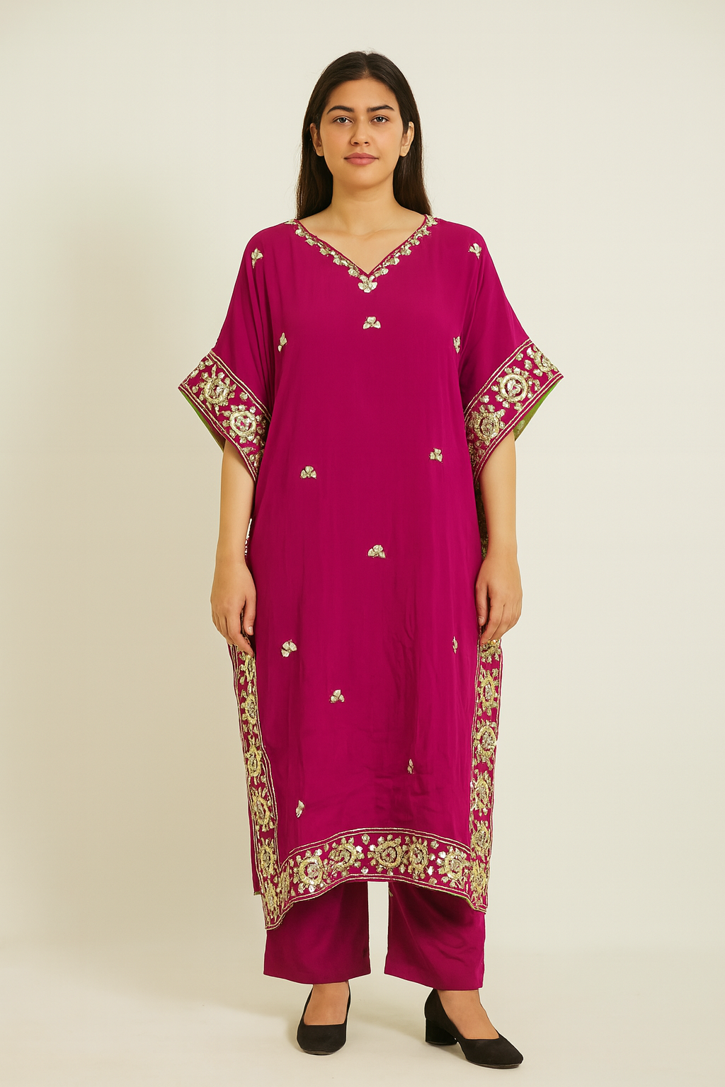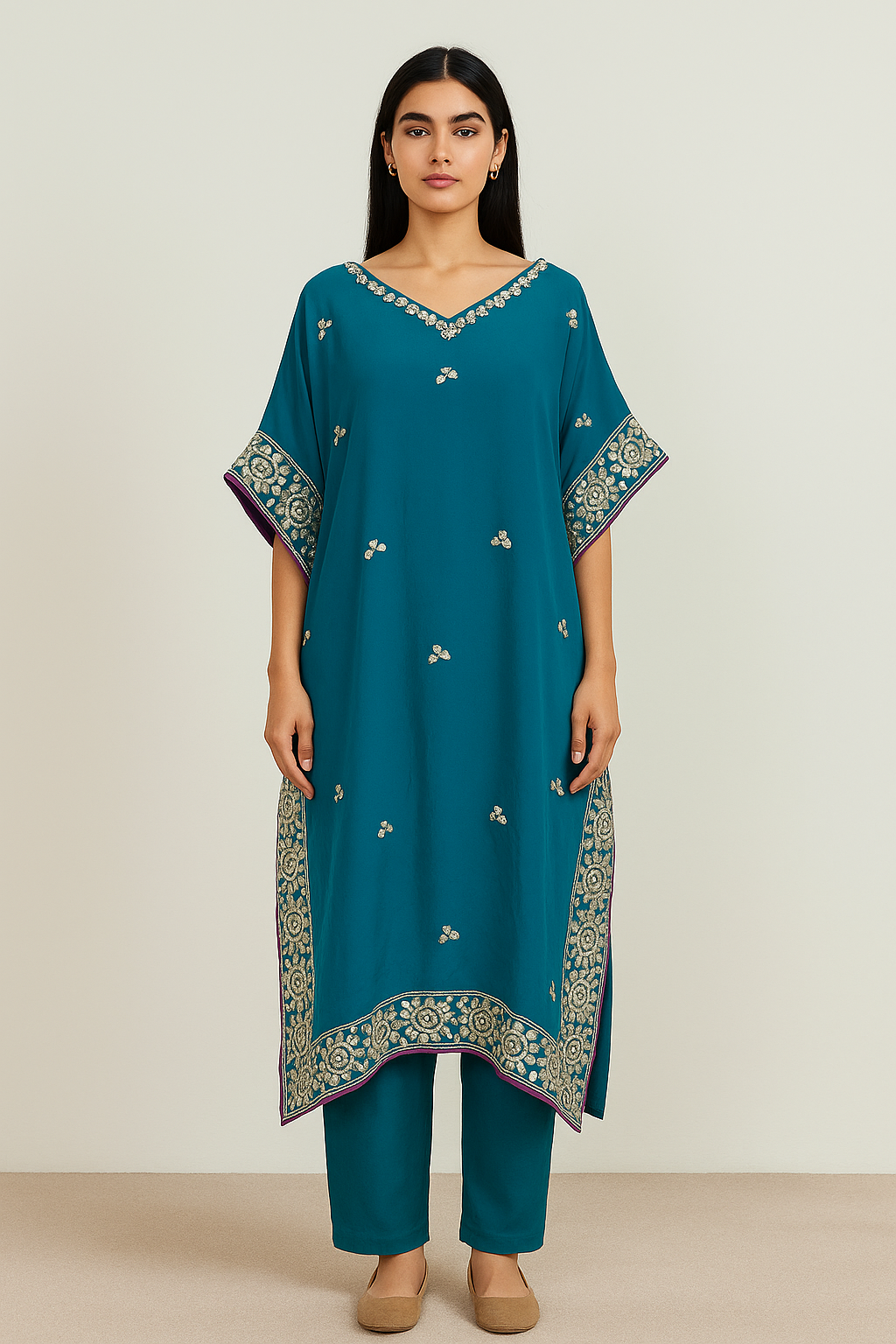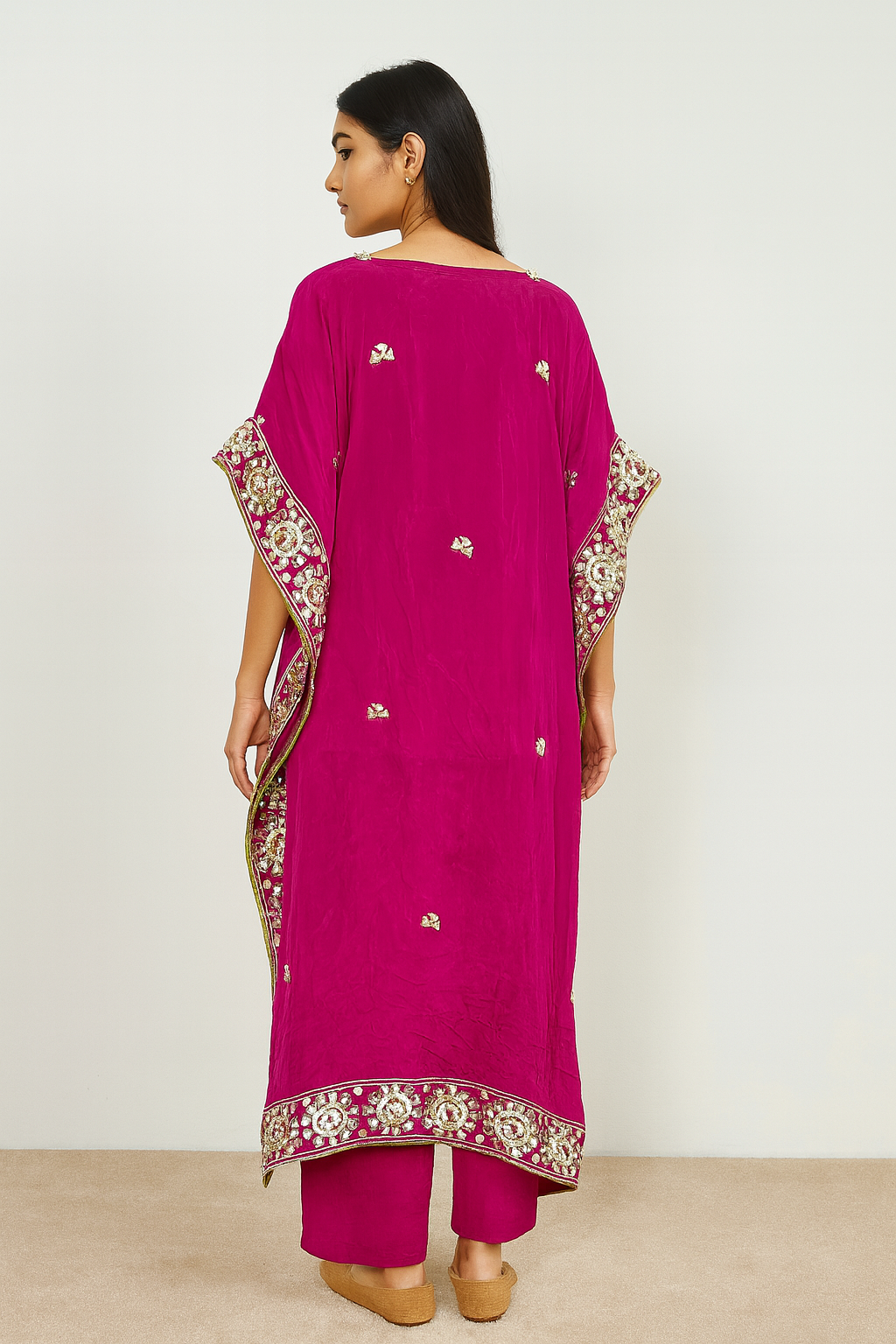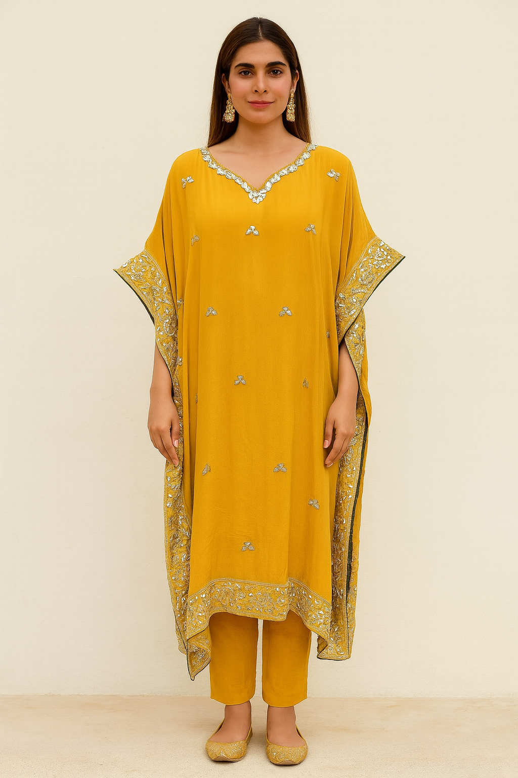 Women’s Pure Chinnon Mustard Embroidered Kaftan with Pants – Festive Wear